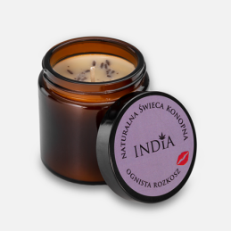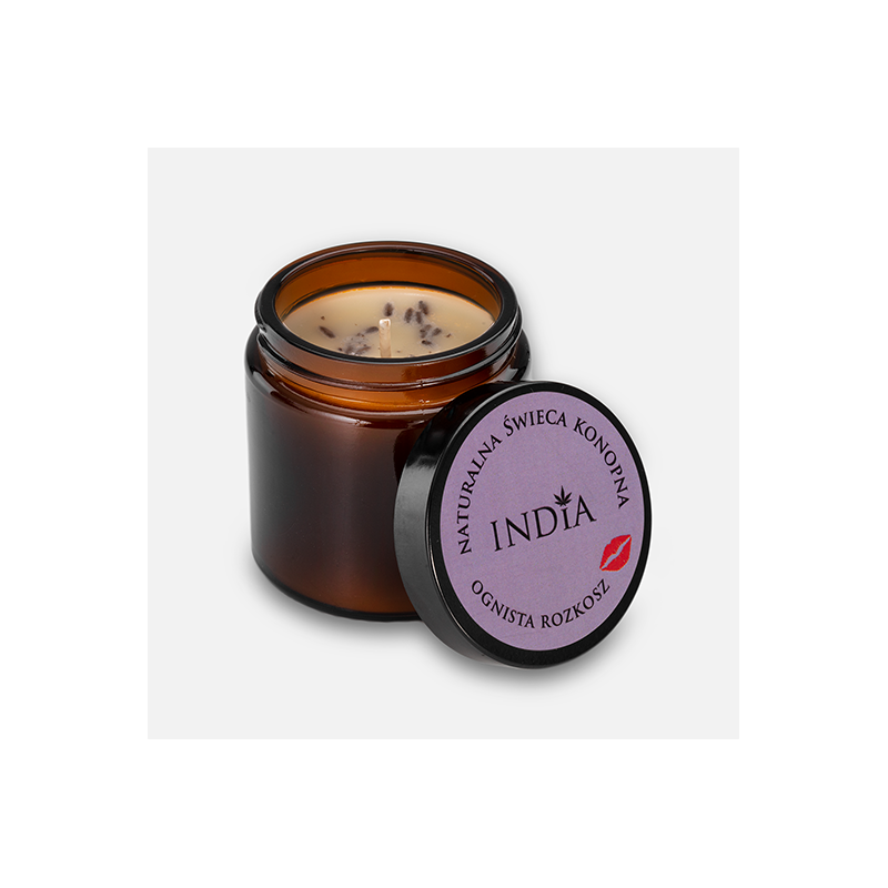 Aromatyczna świeca "Ognista rozkosz" - z naturalnego wosku sojowego, z olejem konopnym, o zapachu lawendy, goździków oraz paczuli.