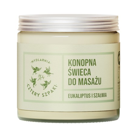 Świeca do masażu Eukaliptus i Szałwia od Czterech Szpaków bazuje - standardowo - na wosku sojowym. Dodali do niej również olej konopny, dzięki czemu zyskała dodatkowe właściwości pielęgnacyjne. Ta świeca zapachowa to bowiem także kosmetyk. Dzięki temu nie tylko roztacza wokół przyjemny, odświeżający, eukaliptusowo-ziołowy aromat, ale również świetnie sprawdza się w roli olejku do masażu.